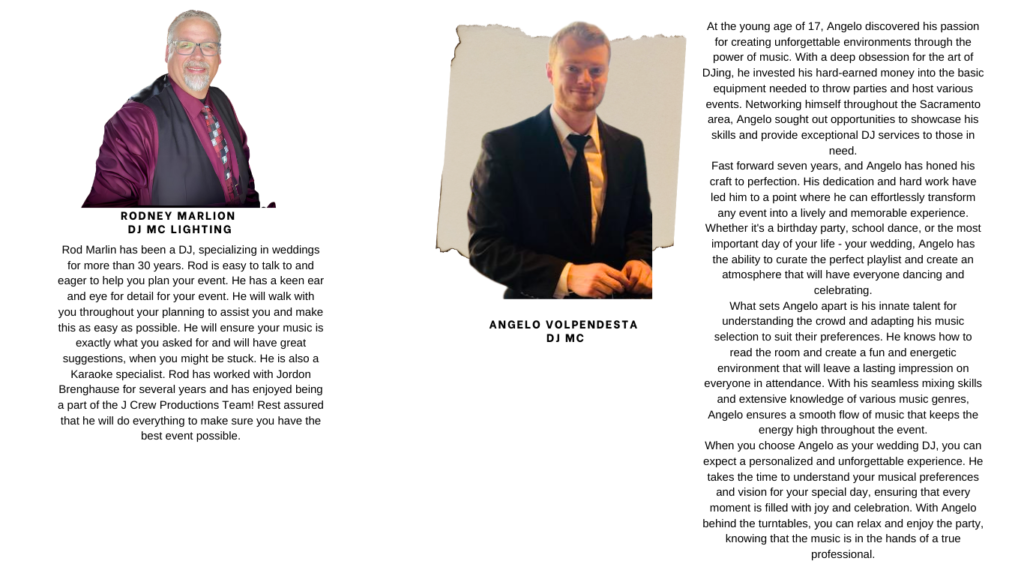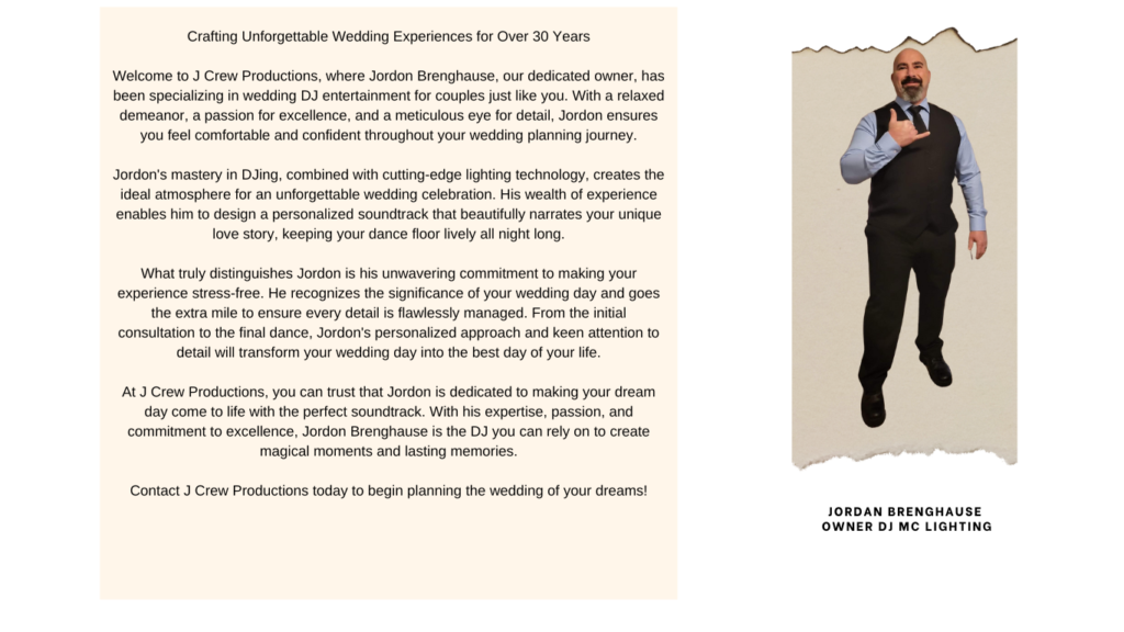 Welcome to J Crew Productions, where Jordon Brenghause, our dedicated owner, has been specializing in wedding DJ entertainment for couples just like you. With a relaxed demeanor, a passion for excellence, and a meticulous eye for detail, Jordon ensures you feel comfortable and confident throughout your wedding planning journey.